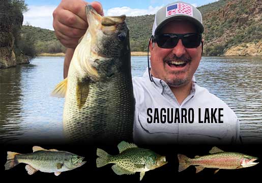 Guide to fishing for largemouth bass, smallmouth bass, channel catfish, flathead catfish, black crappie, rainbow trout, walleye, bluegill and yellow bass at Saguaro Lake in Arizona.